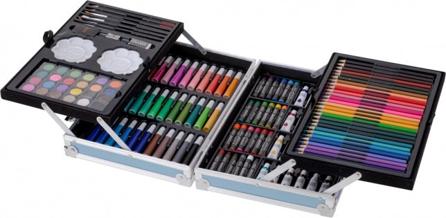 Univerzális képzőművészeti készlet praktikus bőröndben, amely mindent kínál kicsiknek és nagyoknak. Széles szín- és eszközválasztékot találsz benne rajzoláshoz és festéshez – filctollaktól és színes ceruzáktól az akvarelleken, tubusos festékeken át az olajpasztelekig. Kompakt kék bőrönd masszív csatokkal, amely mindent átláthatóan a helyén tart, és ideális otthonra, iskolába vagy utazáshoz. 145 darab a határtalan kreativitásért és a képzelet fejlesztéséért.