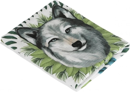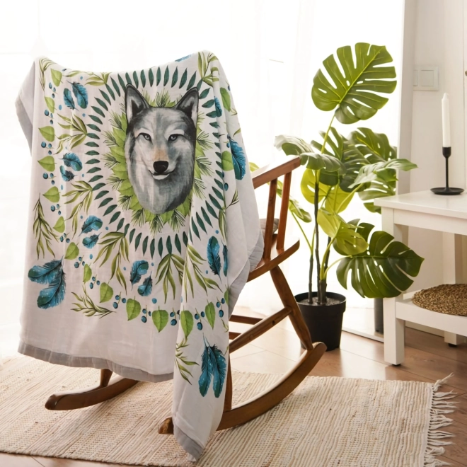 Gyönyörű farkas minta zöld levelekkel és kék tollakkal övezve, amely bátorságot ébreszt. Díszítő elemként egyedi megjelenést ad a környezetnek.