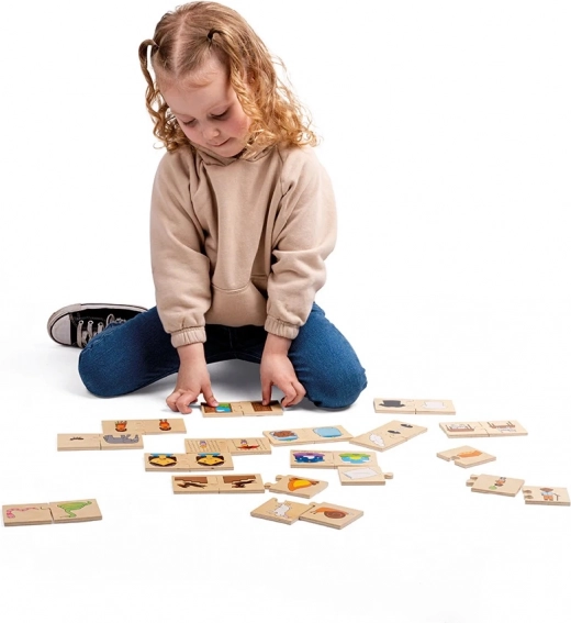 A gyerekek olyan képeket párosítanak, amelyek ellentétes jelentésűek – például nappal és éjszaka, meleg és hideg, szomorú és vidám. A sima, masszív darabokat könnyű megfogni és illeszteni, így a kis kezek az új szavak és összefüggések felfedezésére összpontosíthatnak.