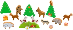 Fa figurák hegyvidéki állatokból, ideális kreatív játékhoz. 10 állatot tartalmaz kiegészítőkkel, minőségi fából készült, vízbázisú festékekkel festve.