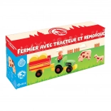 Fa farmer figura traktorral, pótkocsival és állatokkal a Jeujura márkától. Ideális kiegészítő fa építőkészletekhez. Kombináld és alkoss új történeteket.