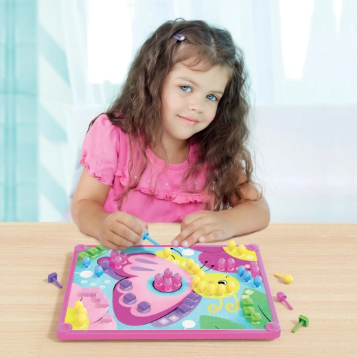 Gombostűs mozaik tárolókosárral és 4 előrenyomtatott képkártyával a tüskék bepöccsentéséhez. A mozaik fejleszti a finommotorikát, a kéz–szem koordinációt és a kreatív gondolkodást. A készlet tartalmaz 4 előrenyomtatott, perforált kártyát, 180 színes tüskét, beszúrható alaplapot, rögzítő keretet és tároló kosarat. 3 éves kortól ajánlott. A csomag tartalma: 1 tároló kosár, 1 lyukakkal ellátott beszúrható alaplap, 1 rögzítő keret, 4 perforált képkártya, 180 színes beszúrható tüske 2 formában és 6 színben. Főbb jellemzők: támogatja a finommotorikát, a kéz–szem koordinációt, valamint a kreatív gondolkodást.
