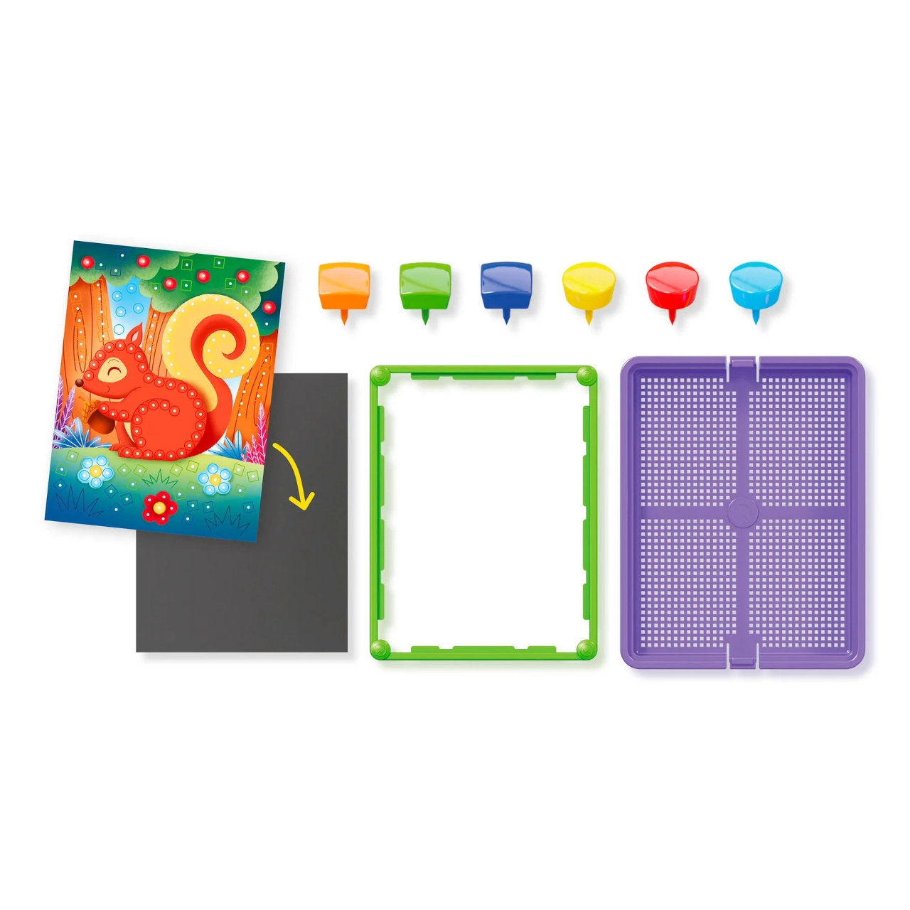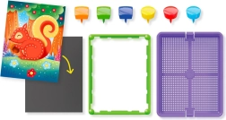 A csomag része 8 előre nyomtatott kártya bájos állatokkal és természeti jelenetekkel, amelyek inspirálják az alkotást és a színek, formák tanulását.
