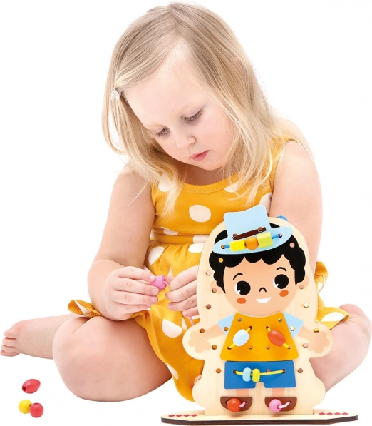 Gyöngyfűzés, zsinór átfűzése és az elemekkel való manipuláció erősíti az ujjakat és javítja a kéz–szem koordinációt – ideális felkészülés az írásra.
