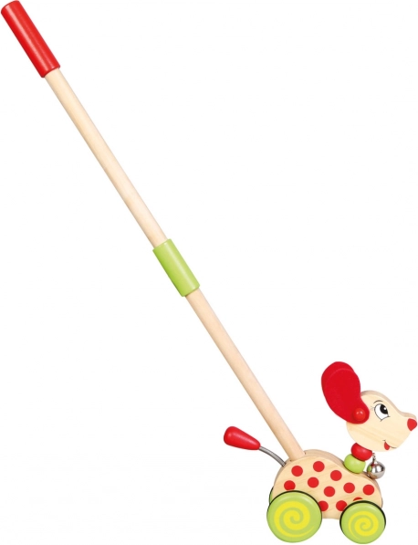 A Bino márkájú, pálcán tologatható fából készült kutyus népszerű mozgásfejlesztő játék, amely sétára és aktív mozgásra ösztönzi a gyerekeket. Előre tolva a kutyus csengője finoman csilingel, ami szórakoztatja a kicsiket és további lépésekre ösztönzi őket. A gumírozott kerekek egyenletes és halk futást biztosítanak különböző felületeken.