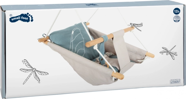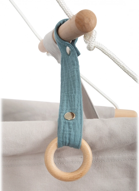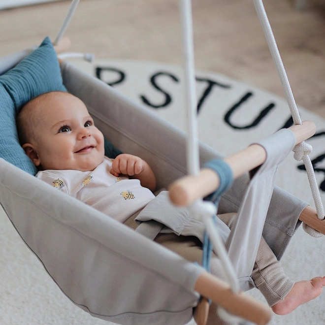 A füstös kék szín és a sima fa stílusos kiegészítővé teszi a hintát.