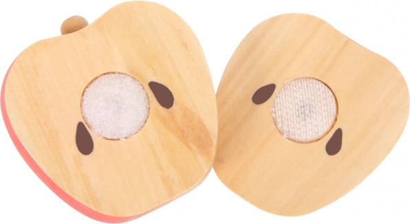 Színes fa darabok (alma, körte, banán, narancs, dinnye), melyek a tépőzárnak köszönhetően könnyen szét- és összepattinthatók – ideálisak a helyes vágási technika gyakorlásához.