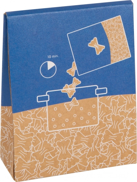 A kartondoboz könnyen nyitható és zárható, hátoldalán pedig érthető, képes „főzési” folyamatot mutat be.