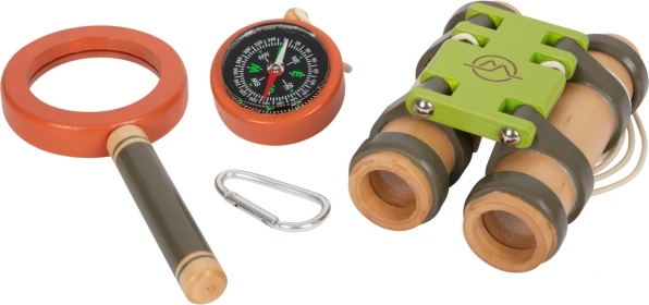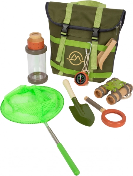 Teljes szett eszközöket tartalmaz a fiatal felfedezők számára. A nagyítótól az iránytűig, mindent, ami szükséges, része a hátizsáknak.