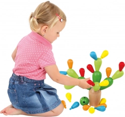 A gyerekek színes „hajtásokat” helyeznek a fa talpra, és egyensúlyt keresnek, hogy a kaktusz ne boruljon fel. A sima, lekerekített formák megkönnyítik a fogást és az építést. A játék fejleszti a türelmet, a tervezést és az egyensúlyérzéket.