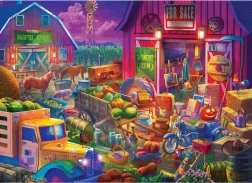Színes, részletgazdag jelenet – „For Sale” feliratú pajta, haszonállatok, terméssel megrakott régi teherautó és szezonális dekorációk. Ideális a vidéki témák és a kidolgozott illusztrációk kedvelőinek.