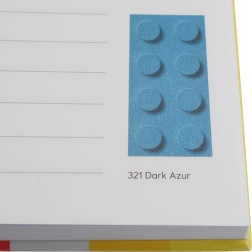 Minden vonalas oldalon egy LEGO elem látható egy konkrét árnyalatban, ami kellemesebbé teszi az írást és ösztönzi a kreativitást.