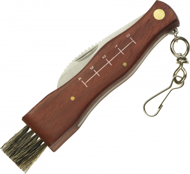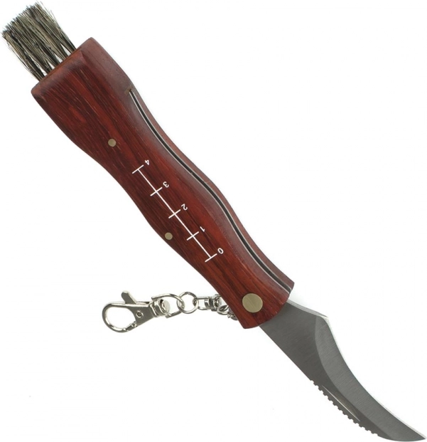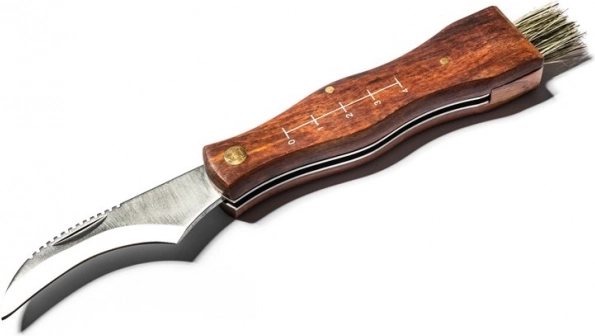 Ez a sokoldalú gombászkés a éles, hajlított pengét a gombák pontos levágásához egy finom ecsettel ötvözi a szennyeződések eltávolítására. A fa markolat kényelmes fogást ad, az egyik oldalon található integrált mérce pedig segít gyorsan megbecsülni a zsákmány méretét.
