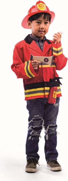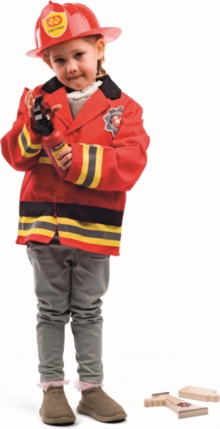 A BIGJIGS TOYS gyerek tűzoltó jelmez mindent kínál, amire a kis tűzoltóknak szükségük van egy izgalmas mentőakcióhoz. Élénkpiros kabát csíkos ujjakkal és emblémával, állítható sisak (49–55 cm), valamint kiegészítők, mint fa poroltó, rádió és megafon, hogy a játék igazán élethű legyen.