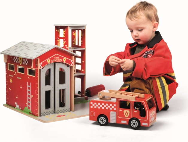 A csomagban fa poroltó, rádió és megafon található – minden, ami az autentikus tűzoltó küldetésekhez és végtelen történetekhez kell.