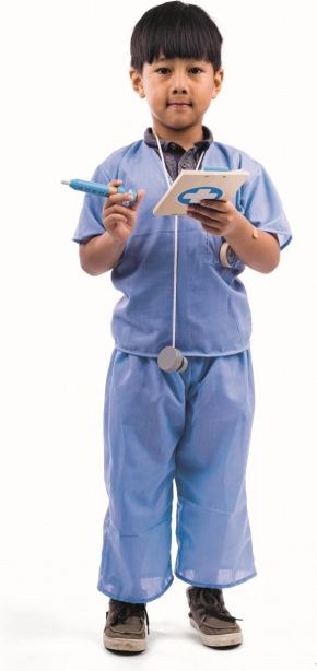 A BIGJIGS TOYS gyerek orvosi jelmeze minden játékot mentőakcióvá varázsol. A készlet része egy kék póló és tépőzáras nadrág az egyszerű fel- és levételhez, valamint gazdag kiegészítők: fa sztetoszkóp, jegyzeteléshez orvosi írótábla, hőmérő, zsebóra, injekciós fecskendő és sebtapaszok. A jelmez pamutból és poliészterből készült, és géppel mosható.