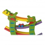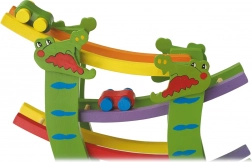Ez a krokodilos fa versenypálya kis versenykörpályává varázsolja a gyerekszobát. A gyerekek a rajtra teszik a kisautót, és figyelik, ahogy a szinteken lendületesen lecsúszik egészen a célig. A vidám krokodilmotívum és a színes kivitel újra és újra játékra hív.