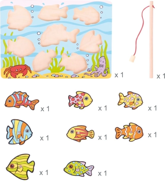 - Teljes készlet: fa tábla, mágneses horgászbot és halacskák – összesen 10 elem