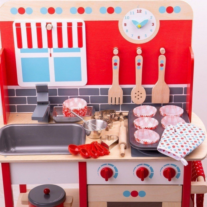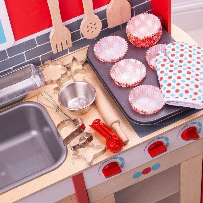 Ez a teljes sütőkészlet tartalmazza az összes felszerelést, amire egy kis szakácsnak szüksége lehet az első sütéseihez. Beleértve tepsit, sütőkesztyűt, kenyérformát, habverőt, fa sodrófát, tálat, mérőkanál készletet és hat sütikiszúrót.
