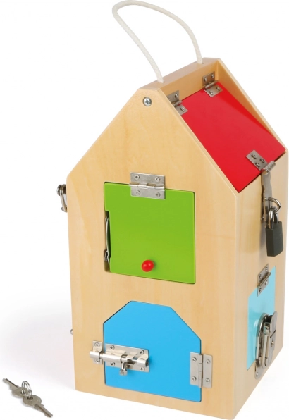 A házikó minőségi fából, erős fémrészekkel készül, ezért intenzív használat mellett is tartós. Kompakt méretének és praktikus fogantyújának köszönhetően könnyen hordozható – ideális utazáshoz, óvodába vagy a gyerekszobába. A színes elemek felfedezésre csábítanak és segítik a színek felismerését.
