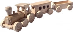 Fa személyvonat megörvendezteti a kis vonat rajongókat. A modell kiváló minőségű bükkfából készült természetes megjelenéssel, amelyet nem kezeltek vegyi anyagokkal.