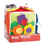 A kocka fűzővel, gombokkal, cipzárral, patentokkal és egyéb elemekkel van felszerelve, amelyek megtanítják a gyerekeket különböző záródásokra.