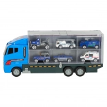 Nagy kék kamion tároló és szállító eszközként szolgál a kis rendőrautók számára. Támogatja a kreativitást és órákon át tartó szórakozást biztosít a gyerekeknek.