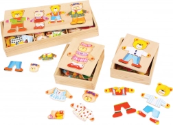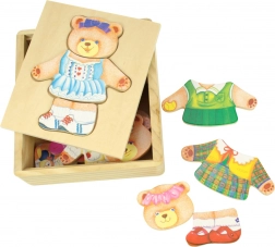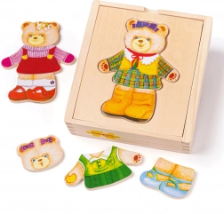 Aranyos, fából készült öltöztetős puzzle a legkisebbeknek: segít a gyerekeknek a mackó mama ruháinak és arckifejezéseinek kombinálásában. Tartalmaz 18 elemet, praktikus dobozt fedélként használható táblával, és fejleszti a finommotorikát, a szem–kéz koordinációt és a szókincset. Minőségi fából készült, 3 éves kortól biztonságos, és megfelel az európai biztonsági szabványoknak.