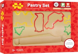 A fa nyújtófa, a vágódeszka, a fakanál és a spatula a kiszúróformákkal együtt motiválja a gyerekeket a sütés felfedezésére, fejleszti a finommotorikát és a képzelőerőt.