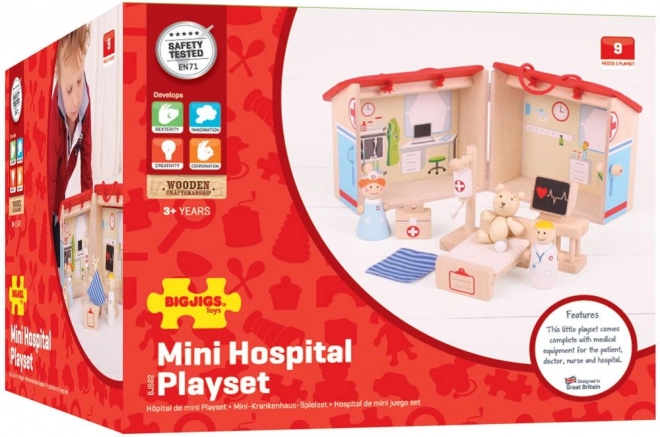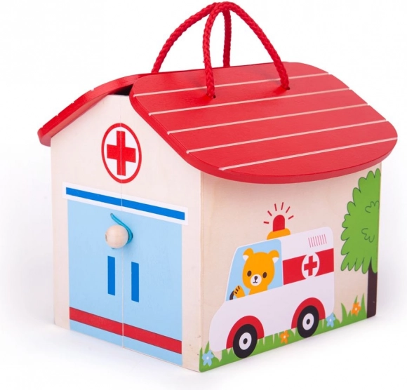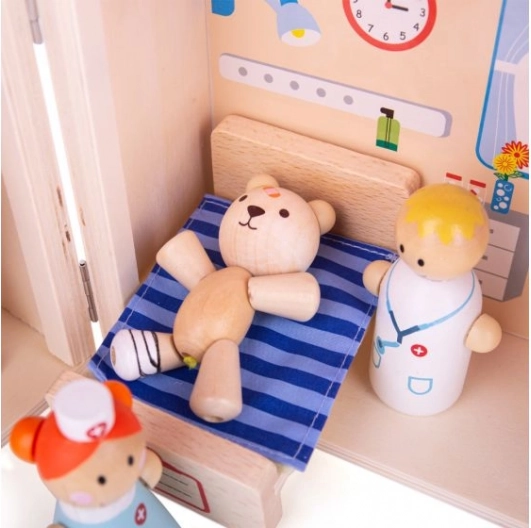 A készlet tartalmaz kórházi ágyat, infúziót, szívmonitort, valamint a mackó, a nővér és az orvos figuráit. A fogantyú és a biztonságos csat gondoskodik arról, hogy minden elem biztonságban legyen, és a készlet mindig készen álljon az utazásra.