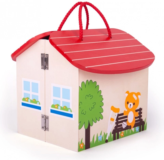 Házikó formájú, fogantyús készlet, amely ideális a hordozáshoz és a játékelemek biztonságos tárolásához.