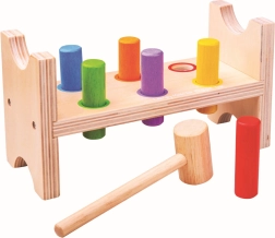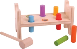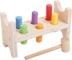 Ez a klasszikus, Bigjigs Baby márkájú fa kalapálós játék egyszerű elvével nyűgözi le a gyerekeket – a pálcikákat a kalapáccsal a nyílásokba kell beütni, majd elég a padot megfordítani, és a móka kezdődhet elölről. Az élénk színek ösztönzik az észlelést és támogatják a figyelem összpontosítását.