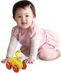 Ez a vidám guruló zsiráf ideális első játójármű a kicsi kezekbe. A játék döntésével a gyermek könnyedén változtatja a haladás irányát, ami természetes módon fejleszti a szem–kéz koordinációt és támogatja az aktív játékot. A kerekeken lévő gumigyűrűk simán és halkan gördülő mozgást biztosítanak különféle felületeken.