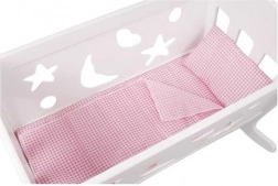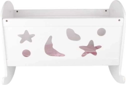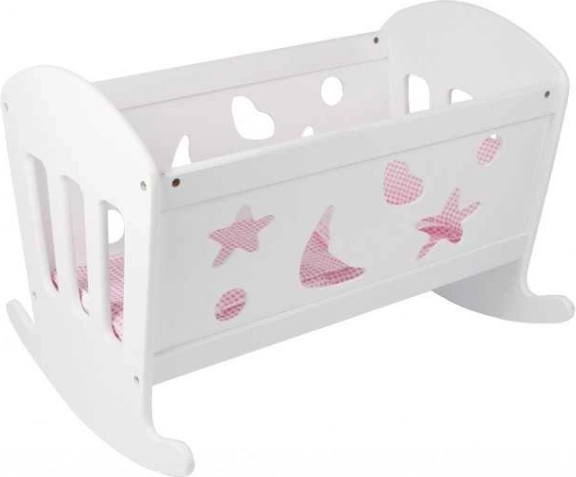 Ez a fehérre lakkozott bölcső szép nap-, hold- és csillag alakú kivágásokkal rendelkezik. Tartozékai a takaró, a párna és a matrac.