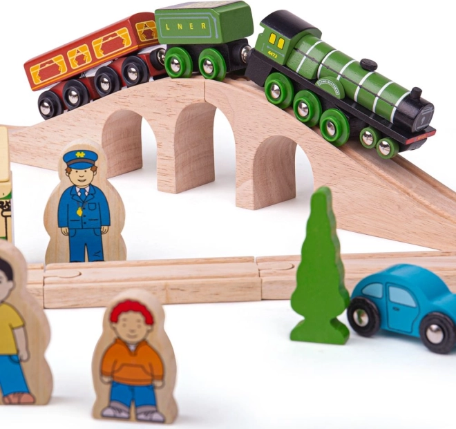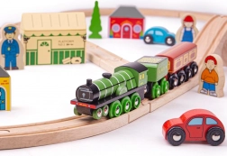A Flying Scotsman a kora egyik leghíresebb vonata, és ezzel a fa vonatpályával a gyerekek újra átélhetik híres utazásait. A készlet gyönyörűen kidolgozott vonatot tartalmaz, amely nosztalgikus utazásra visz viaduktokon és természeti tájakon át. A pályát retro állomások, házak és autók szegélyezik.