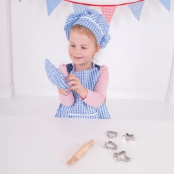 Fiatal szakácsok imádni fogják ezt a világos és kellemesen kék pamut készletet sütéshez és főzéshez. Tartalmaz kötényt, kesztyűt, szakácssapkát, sodrófát és sütikiszúrókat, ideális a szórakoztató főzéshez és szerepjátékhoz.