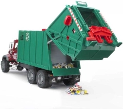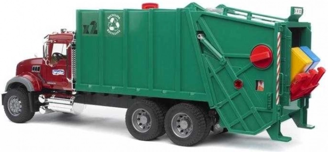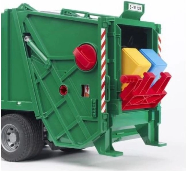 A teljesen működő emelő a szemeteseket a tartályba üríti, ahol a hulladékprés az anyagot a jármű hátsó részébe tolja. Megtelt állapotban a hátsó ajtó kinyitható, és a rakomány kiüríthető. Mindezt kiegészítik a nyitható fülkeajtók, a felnyitható motorháztető betekintéssel a motorra és a lehajtható visszapillantó tükrök. A modell Németországban készült, minőségi műanyagból, és intenzív gyerekjátéknak is ellenáll.