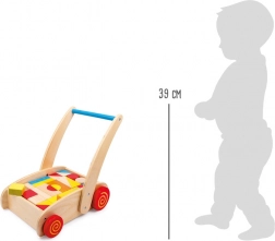 Fedezze fel az ideális segítőt az első lépésekhez – fa járássegítő kocsi tele színes kockákkal. A tömör fából és rétegelt lemezből készült robusztus szerkezet stabilitást ad, míg a különböző formájú bükkfa kockák (kb. 5–10 cm) alkotásra ösztönöznek. A 39 cm magasságú, kényelmes fogantyúnak köszönhetően a gyerekek magabiztosan és biztonságban érezhetik magukat.