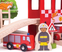 Létra, tűzcsap, állatokkal teli fa és tűzoltó figurák teremtenek hiteles helyzeteket – a tűzoltástól a fáról való macskamentésig.