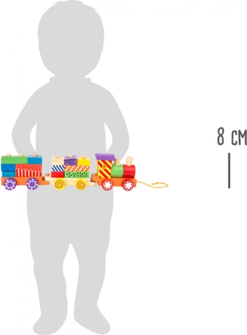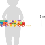 Szórakoztató húzogatós kisvonat a legkisebbeknek, fejleszti a mozgáskoordinációt, az összerendezett mozgást és a fantáziát. A színes fa építőelemeknek köszönhetően a mozdony és a két kocsi könnyen átalakítható, a kocsik összekapcsolhatók és zsinórral húzhatók. Vidám színek és minták hívogatnak játékra és tanulásra.