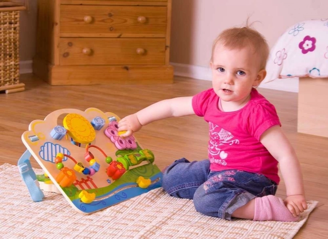 A gyöngyös útvesztő, a forgó labirintus és a csúszkáló elemek támogatják a fogást, a kéz–szem koordinációt és az önfeledt felfedezést már 6 hónapos kortól.