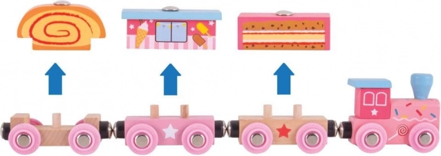 A bájos, rózsaszín árnyalatú fa vonat minden kis mozdonyvezetőt elragadtat. A készlet egy mozdonyból és három, részletgazdagon kidolgozott kocsiból áll, melyek mágnesesen kapcsolódnak, teljes mértékben kompatibilisek a legtöbb fa vonatpályával, és a csomagban ráadásként 3 darab sín is található a pálya bővítéséhez.