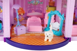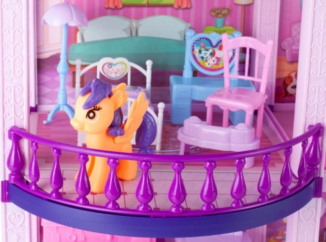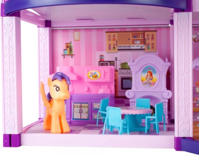 Egyedi, műanyagból készült babaház, amely ideális hosszú órákon át tartó szórakozáshoz minden kislánynak és barátainak. A ház tökéletes a készlet részét képező pónik és kutya, illetve babák számára. Ebben a rezidenciában mindenki úgy érzi magát, mint egy palotában. A nagy házhoz nagyobb bútordarabok is tartoznak, így a játék könnyebb és élethűbb. A belső terek tökéletesen tükrözik az igazi otthon hangulatát.