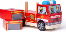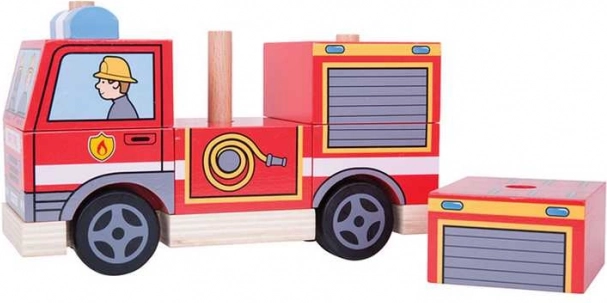 Ez az okos játék ötvözi a szórakozást és a tanulást: a gyerekek fa rudakra rakosgatják az egyes elemeket, fejlesztik a koordinációs készségeket, a formák és színek felismerését, majd a kész tűzoltóautóval izgalmas történeteket játszhatnak el. A masszív fa, a sima élek és a feltűnő színek biztonságos és vonzó játékélményt nyújtanak.