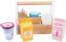 Ez a masszív fa láda négy italos kartont rejt (tej, narancslé, eper- és csokoládéturmix), továbbá egy pohár joghurtot és tejszínt. Ideális kiegészítő a gyerekkonyhába vagy a játékboltba, játékos formában ismerteti meg a gyerekekkel az egészséges táplálkozás alapjait és az élelmiszerek eredetét.