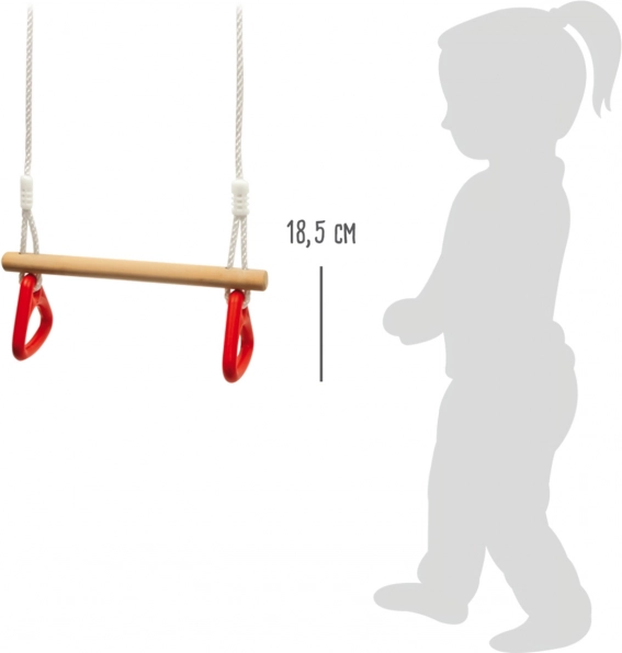 Ez az okos, 2 az 1-ben hinta és tornász rúd gyűrűs markolatokkal egyszerre nyújt szórakozást és edzést a gyerekeknek. Lehet rajta ülni, hintázni, húzódzkodni és fogáserőt gyakorolni. A masszív fa rúd és a tartós műanyag markolatok biztonságot adnak a gyakorláshoz, míg az állítható köteleknek köszönhetően a magasság könnyen személyre szabható.