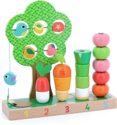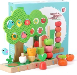 Ez a minőségi fa játék egyesíti a szórakozást és a tanulást. A gyerekek répát, póréhagymát, paradicsomot és más formákat fűznek és raknak az 1–5-ig számozott tüskékre, így természetes módon sajátítják el a számolást, valamint a színek és méretek szerinti válogatást. A készlet része egy kis fa is csúszó elemekkel a felfedezéshez és a szem–kéz koordináció gyakorlásához.
