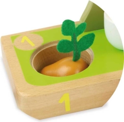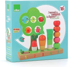 Az 1–5-ig számozott fa alaplap megtanítja a gyerekeknek a számolást és a mennyiségek összehasonlítását. A zöldségek és formák egymásra rakása támogatja a logikus gondolkodást és a koordinációt.