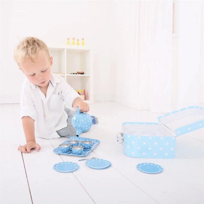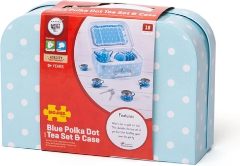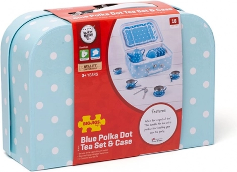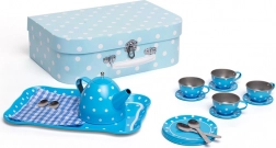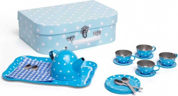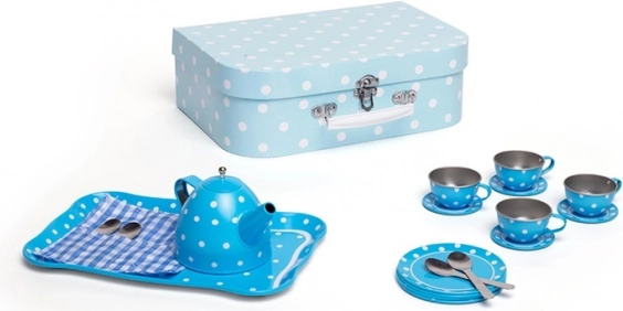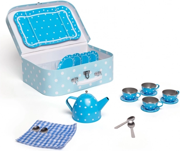 Stílusos kék, pöttyös teaszett masszív bőröndben, amely minden kis vendéglátónak örömet szerez. Tartalmaz mindent a tökéletes gyerek „teadélutánokhoz” – a kannától a csészéken és csészealjakon át. A fém kivitelnek köszönhetően a szett strapabíró, könnyen hordozható és ideális utazáshoz. A játék fejleszti a kreativitást, a fantáziát és a társas készségeket, és megfelel az európai biztonsági szabványoknak.