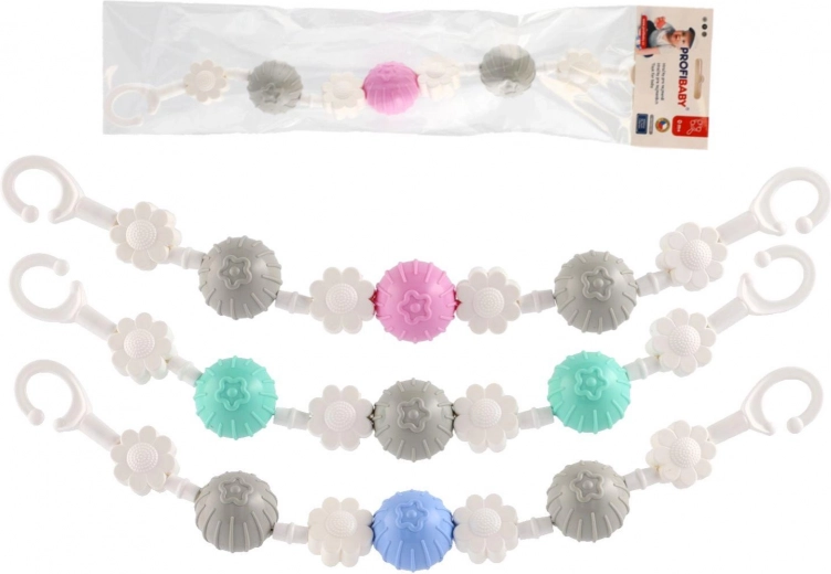 Váltakozó virágok és golyók különböző textúrákkal fejlesztik a tapintást, a látást és a koncentrációt, és ösztönzik a babát a megfogásra és forgatásra.